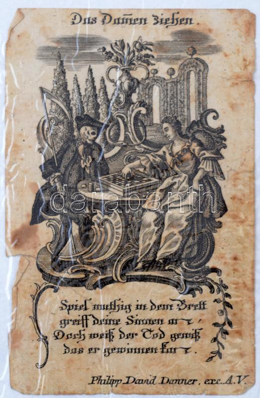 cca XVII- sz. Antik, rézmetszetes szentkép. Halállal ostáblázó hölgy. Szakadással / Ecthed card. Women playing checkers with Death. With tear 8x10 cm