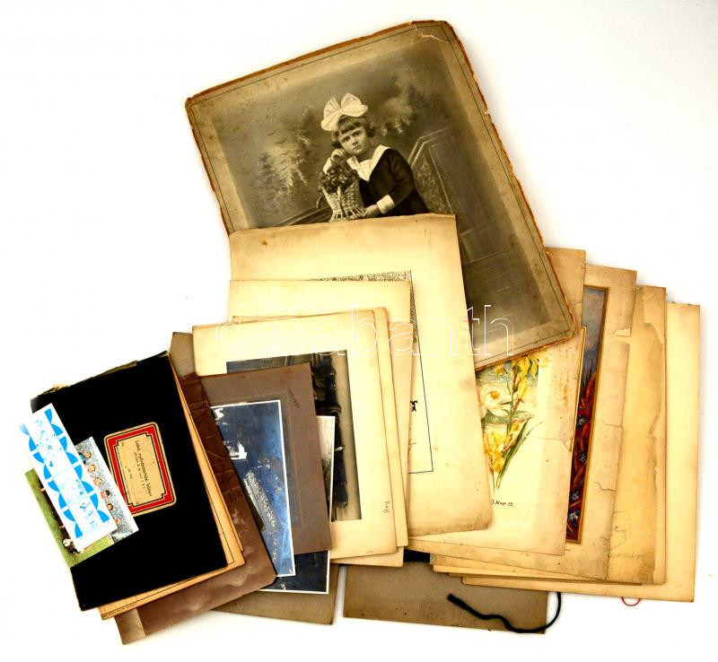 Vegyes papÃrrégiség tétel, kb. 20 db, többségében fotók, egy lakó nyilvántartási köny, Magyar GyorsÃrók Egyesületének egy oklevele, egy keresztelési és egy esketési emléklap, különféle méretben, változó állapotban.