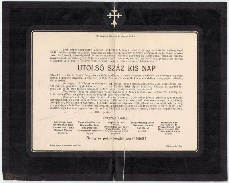 cca 1910-1918 Az "Utolsó száz kis nap" gyászjelentése, hajtott, szakadással
