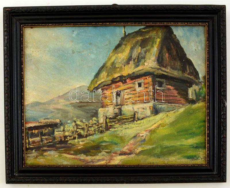 Jelzés nélkül: Alpesi házikó. Olaj, farost, keretben, 26×32 cm