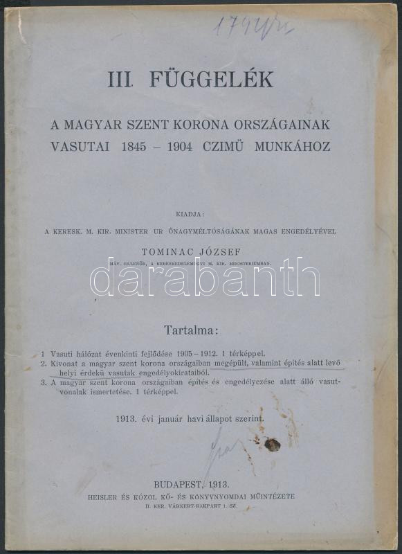 1913 Bp., III. Függelék a Magyar Szent Korona országainak vasutai 1845-1904 című munkához, kiadja Tominac József, 25p