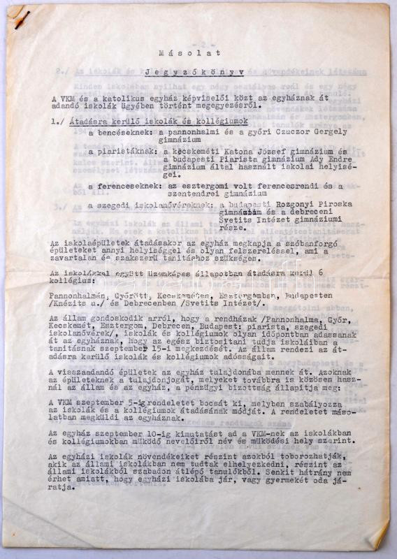 1959 Jegyzőkönyv a VKM és a katolikus egyház képviselői közt az egyháznak átadandó iskolákról, 1951-es jegyzőkönyv másolata.