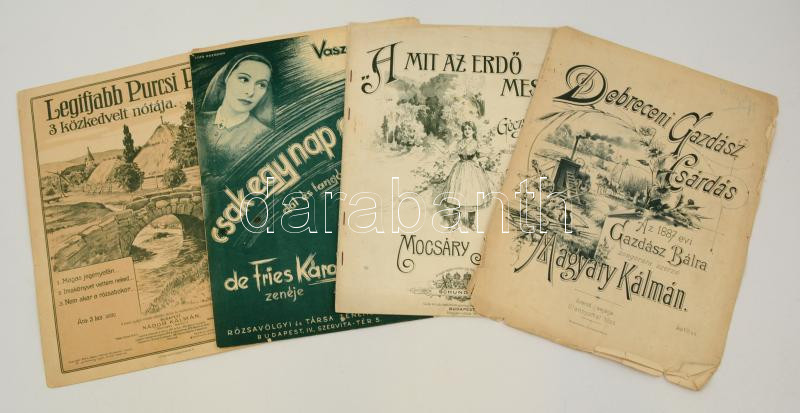 4 db illusztrált kotta (Csak egy nap a világ, Amit az errdő mesél, Deb... https://www.darabanth.com/en/284-Online-auction/284.0/Other-collectibles/Printed-Materials~27/4-db-illusztralt-kotta-Csak-egy-nap-a-vilag-Amit-az-errdo-mesel-Debreceni-Gazdasz-Csardas-~II1480275