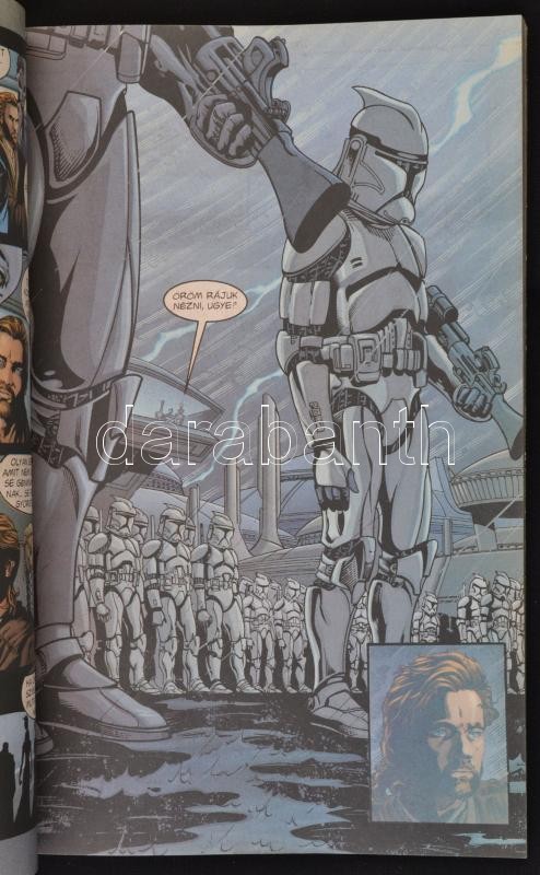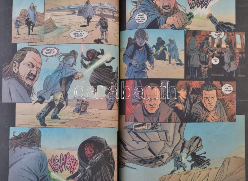 Star Wars képregények, 3 db: 1999 Henry Gilroy: Star Wars I. Baljós Árnyak. Ceruzarajz Rodolfo Damaggio, tusrajz Al Williamson. Fordította: Galamb Zoltán, Tóth Tamás. Kiadói tűzött papírkötés, kissé gyűrött borítóval. 2002 Henry Gilroy: Star Wars II. A klónok támadása. Ceruzarajz Jan Duursema, tusrajz Ray Kryssing. Fordította: Galamb Zoltán, Tóth Tamás. Kiadói tűzött papírkötés. Jó állapotban. 2005 Miles Lane: Star Wars III. A Sith-ek bosszúja. Rajzolta Doug Wheatley. Fordította: Galamb Zoltán. Kiadói tűzött papírkötés, a borító és a képregény teste elvált egymástól, egyébként jó állapotban.