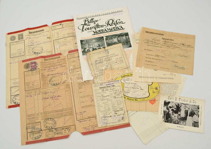 cca 1900-1940 Kis, vegyes nyomtatvány és okmány tétel (10 db), közte hajózási reklám, hajós számla, gyorsáru-fuvarlevél, hajtási jogosítvány, adóbizonyítvány