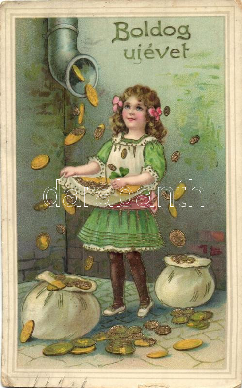 'Boldog Új Évet!' / New Year's greeting card, child, money rain, golden decorated litho (EK)