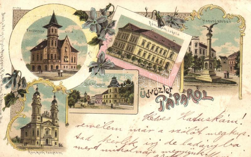 Description: 1899 Pápa, Fenyvessy villa, Római katolikus iskola és templom, Dohány gyár, Honvéd szobor, Regel u. Krug, Hans Nachbargauer, floral Art Nouveau litho (EK)