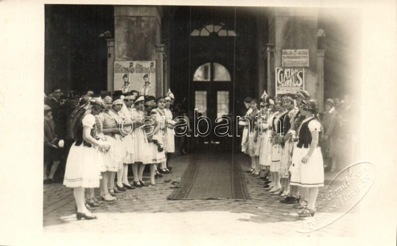 ~1930 Debrecen, Pártás lányok sorfala városi ünnepségen a Munkaközvetítő irodája előtt, Berzéki műterem photo