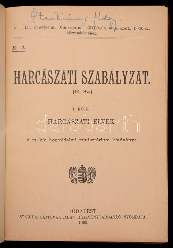 Harcászati szabályzat. I. rész Harcászati elvek. Bp., 1939, Stádium Sa... https://www.darabanth.com/en/285-Online-auction/285.0/Books/Books-Military~100032/Harcaszati-szabalyzat-I-resz-Harcaszati-elvek-Bp-1939-Stadium-Sajtovallalat-Rt-Kiadoi~II1487636