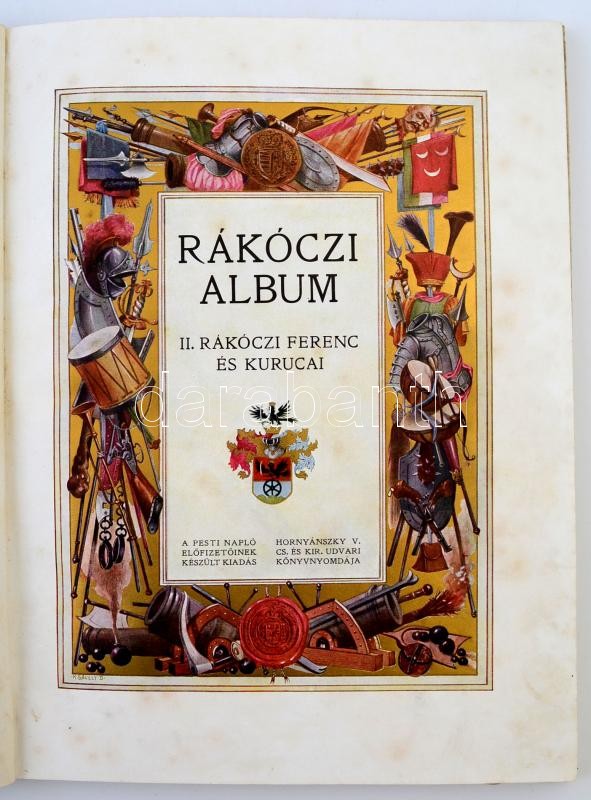 2 Rákóczi témájú könyv: Rákóczi album. II. Rákóczi Ferenc és kurucai. A Pesti Napló előfizetőinek készült kiadás. Hornyánszky V. Cs. és Kir. Udvari Könyvnyomdája. Kiadói dombornyomott, aranyozott egészvászon kötés, illusztrált, a borítója foltos, 48-55. és 82-91. oldalak között a lapok kijárnak, pár lap széle szakadozott. Hock János: Rákócziné. Bp., 1907, Athenaeum Irodalmi és Nyomdai Rt. Kiadói festett, aranyozott, illusztrált egészvászon kötés, kissé kopottas borítóval.