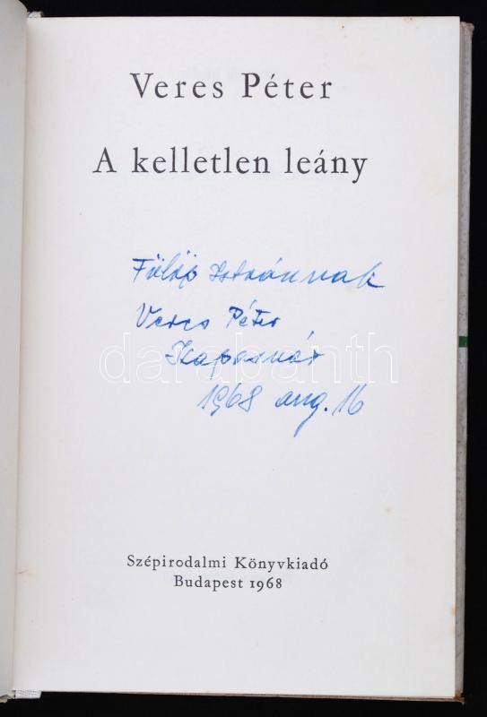Veres Péter: A kelletlen leány. Bp.,1968, Szépirodalmi. Kiadói kopottas egészvászon-kötésben. Dedikált példány!