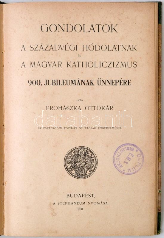 Prohászka Ottokár: Gondolatok a századvégi hódolatnak és a magyar kath... https://www.darabanth.com/en/285-Online-auction/285.0/Books/Books-Religion~100039/Prohaszka-Ottokar-Gondolatok-a-szazadvegi-hodolatnak-es-a-magyar-katholiczizmus-900-jubileum~II1385261