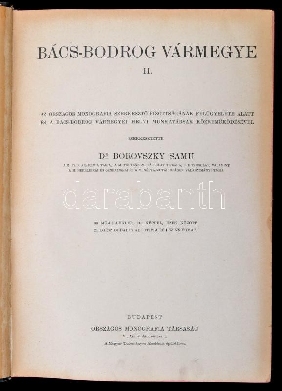 Dr. Borovszky Samu (szerk.): Bács-Bodrog Vármegye II. Töredék kötet. Magyarország vármegyéi és városai, Magyarország monográfiája. Több képpel, térképpel és műmelléklettel illusztrálva. Budapest, é.n. [1909], Országos Monográfia Társaság, 4+616 p.+2 t. Kiadói aranyozott, festett, dombornyomott egészvászon kötés, festett lapszélekkel. A borítója foltos, a gerince javított, pár lap fotlos.