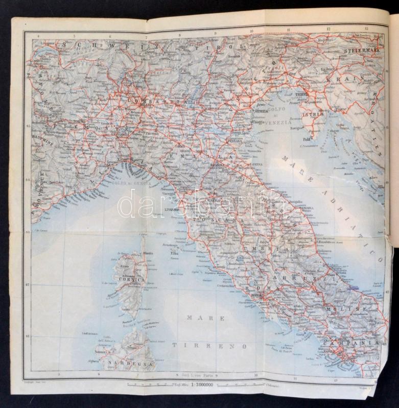 Description: Karl Baedeker: Italien von den Alpen bis Neapel. Kurzes Reisehandbuch. Leipzig, 1908, Verlag von Karl Baedeker, XLII+412 p. Hatodik kiadás. Kiadói aranyozott egészvászon kötés,kissé kopottas borítóval, festett lapélekkel, térképekkel illusztrálva. Német nyelven. / Linen-binding, in german language. Sixth edition. The cover is little bit wearing.