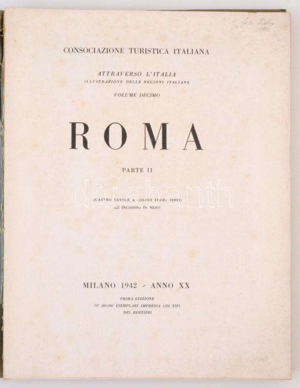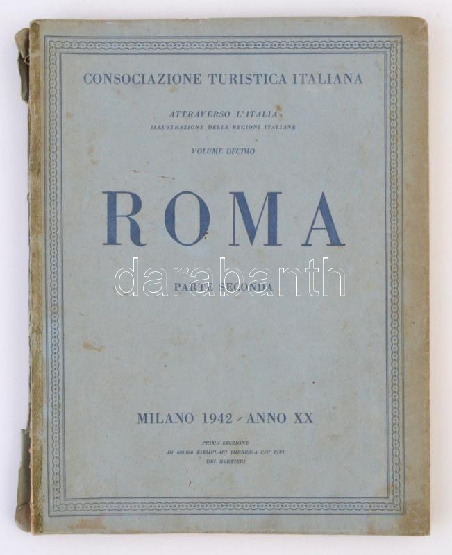 Roma parte II. Milano, 1942, Consociazone Turisctica Italina. Kiadói papÃrkötés, megviselt állapotban, a borÃtója szakadt, az elülsÅ‘ kötéstábla leszakadt, fekete-fehér fotókkal illusztrálva, olasz nyelven. / Paperbinding, with lot of black and white pictures, in italian language. The cover damaged.