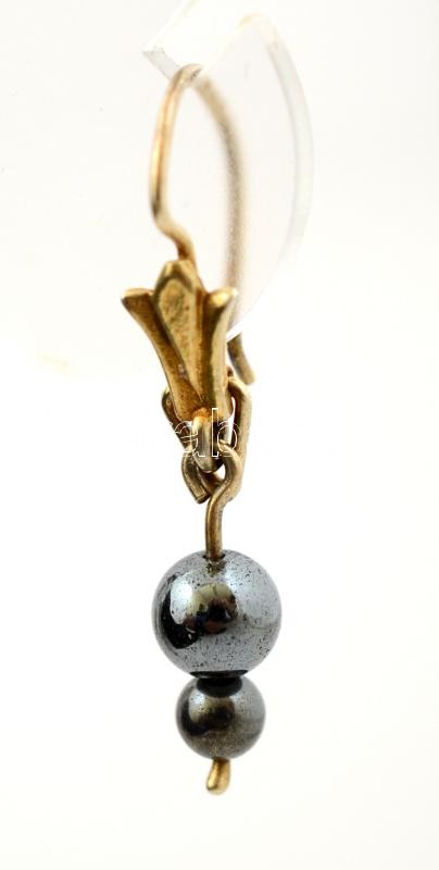 Aranyozott ezüst fülbevaló hematit golyókkal. Jelzett.