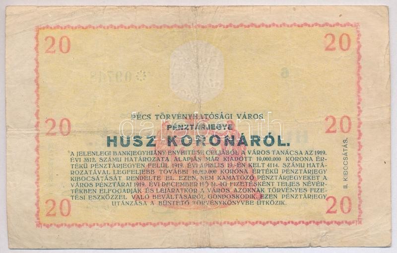 Hungary / Pécs 04.04.1919 20 Korona "Receipt" rosette before serial number C:F,VG