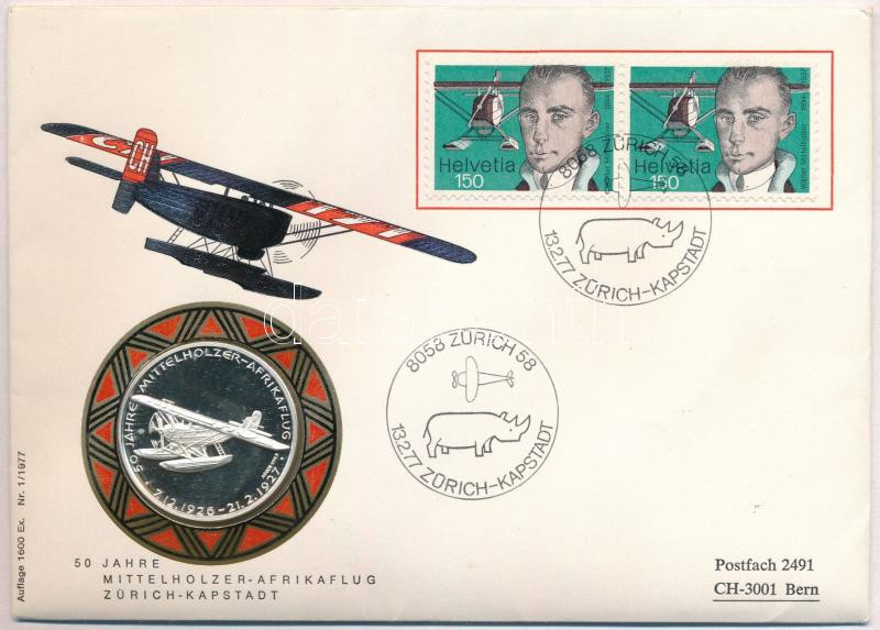 Svájc 1977. "Walter Mittelholzer" Ag emlékérem lezárt boríté...