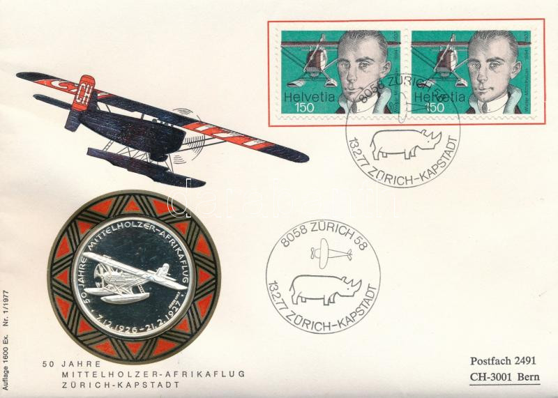 Svájc 1977. "Walter Mittelholzer" Ag emlékérem lezárt boríté...