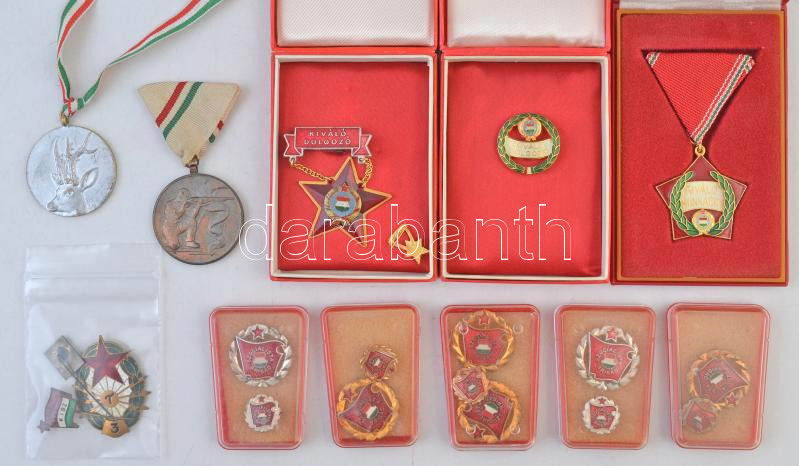 ~19db-os vegyes díjérem, jelvény és kitűző tétel, közte DN "Országos Trófea Bíráló Bizottság Budapest" ezüstözött fém díjérem nemzetszínű szalagon (40mm), ~1960-1970. "MOL Törzsgárda" zománcozott fém kitűző (12x16mm), valamint "Szocialista Brigád" és "Kiváló Dolgozó" jelvények T:2
