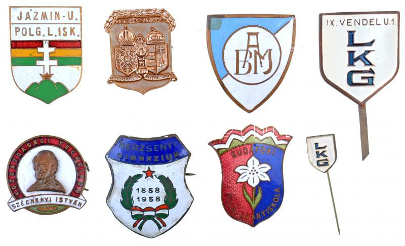7db-os vegyes iskola tematikájú jelvény tétel, közte ~1930-1940. "Jázmin-u. Polg. L. Isk." zománcozott fém jelvény (24x33mm) T:2,2-