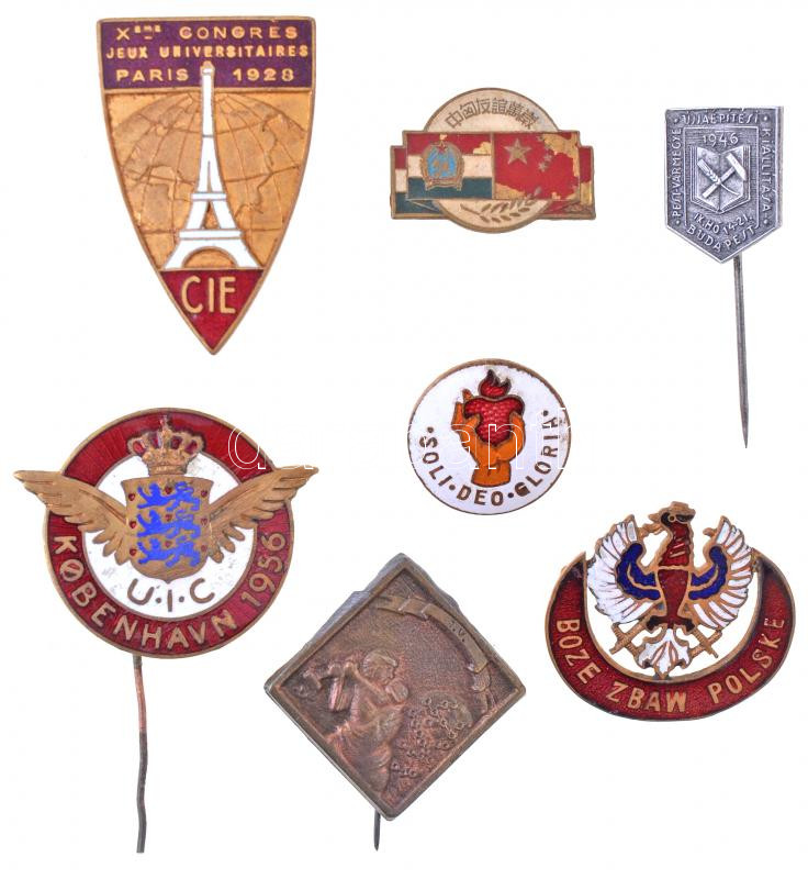 Description: 7db-os vegyes magyar és külföldi jelvény és kitűző tétel, közte Franciaország 1928. "X. Egyetemi Játékok Kongresszus" zománcozott jelvény (23x36mm) T:2