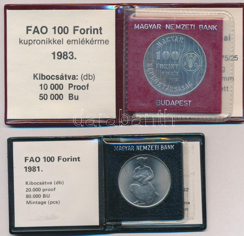 Description: 1981. 100Ft Ni "FAO I. - Világélelmezési nap" + 1983. 100ft Cu-Ni "FAO-SOROZAT II. - Több gabonát a világnak" mindkettő eredeti tokban, tanúsítvánnyal T:BU