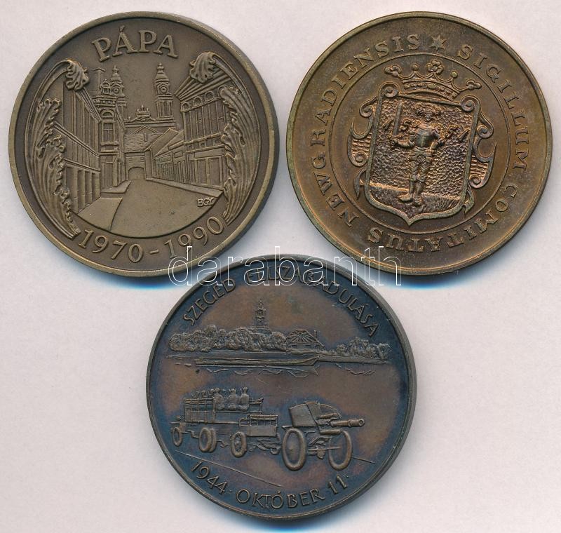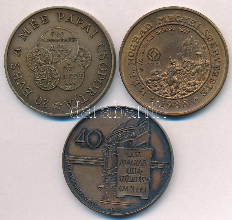 Bognár György (1944-) 1990. "MÉE Pápa - 20 éves a Pápai Csoport" Br emlékérem (42,5mm) + 1988. "MÉE Nógrád Megyei Szervezete - Hollókő vára a Világ Kulturális Örökség része" Br emlékérem (42,5mm) + Fritz Mihály (1947-) 1984. "MÉE Csongrád - Szeged felszabadulásának 40. évfordulója / Lesz magyar újjászületés! MN FF" Br emlékérem (42,5mm) T:1-,2