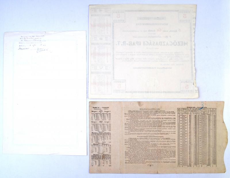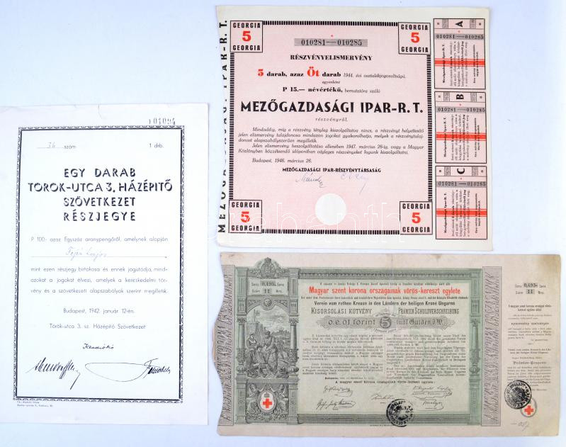 Description: Budapest 1882. "Magyar szent korona országainak vörös-kereszt egylete" kisorsolási kötvény 5Ft-ról + Budapest 1942. "Török utca 3. Házépítő Szövetkezet" részjegye 100P-ről + Budapest 1946. "Mezőgazdasági Ipar Rt" részvénye öt darab részvénye egyben összesen 75P névértékben T:II-,III szakadás