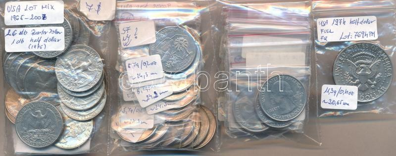 Amerikai Egyesült Államok 1965-1998. 25c Cu-Ni (21x) + 1999-2008. 25c Cu-Ni "50 állam negyeddollárosok" (16db, 14klf) + 2011-2015. 25c Cu-Ni "Gyönyörű Amerika negyeddollárosok" (12db, 10klf) + 1974. 1/2$ Cu-Ni "Kennedy" + 1976. 1/2$ Cu-Ni "Bicentennial kiadás" T:2,2-