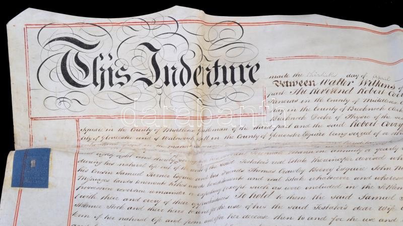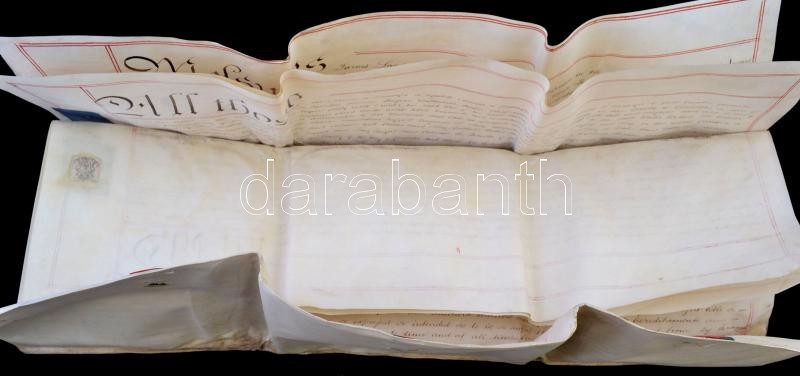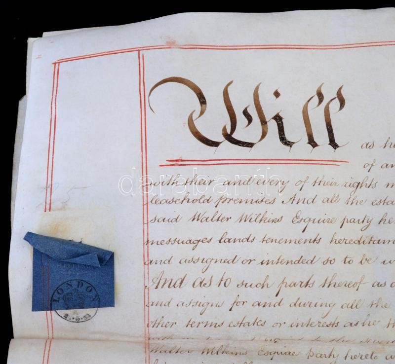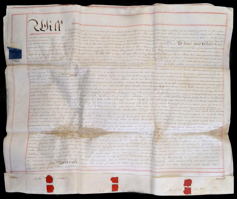 1833 Walter Wilkins (Maeslough, Radnor Esquire) végrendelete, angol nyelven, papíron, rányomott viaszpecsétekkel, 6 fol., helyenként foltos / 1833 Testament of Walter Wilkins of Maeslough, Radnor Esquire, in English, on paper, with vax seals on it, fol. 6, stained