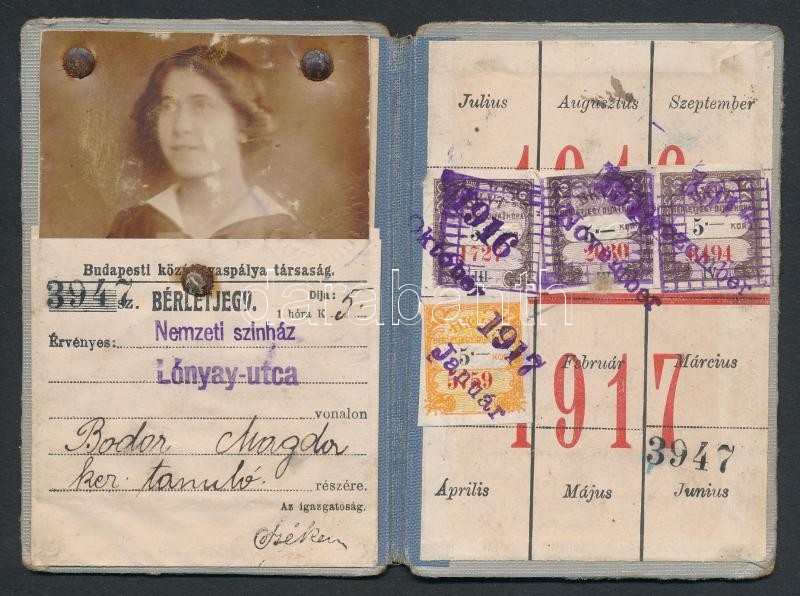 1916 A Budapesti közúti vaspálya társaság tanuló bérletjegye