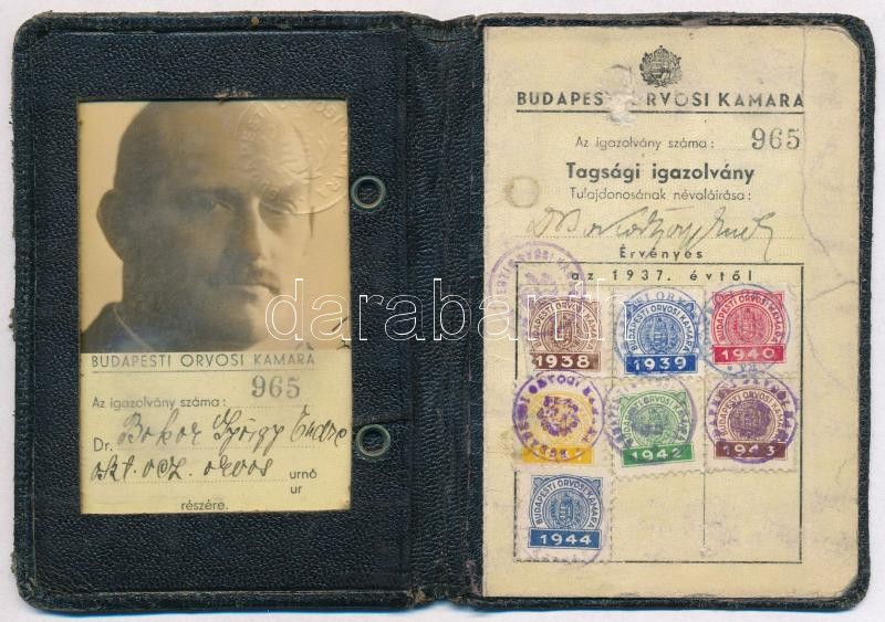 1937 a Budapesti Orvosi Kamara fényképes tagsági igazolványa, tagsági ...