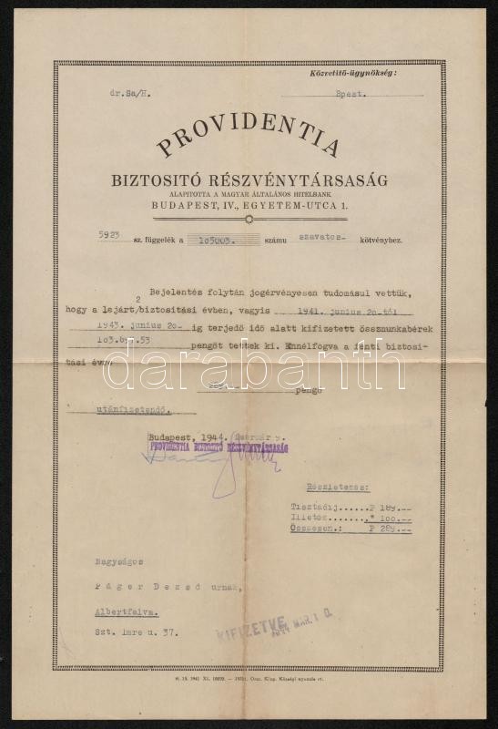 1944 Bp., A Providentia Biztosító Részvénytársaság 2 db függeléke kötv...