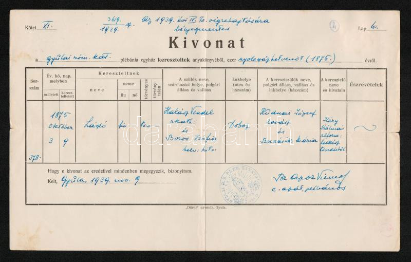 1939 Gyula, Keresztelési anyakönyvi kivonat, rajta Apor Vilmos püspök ...