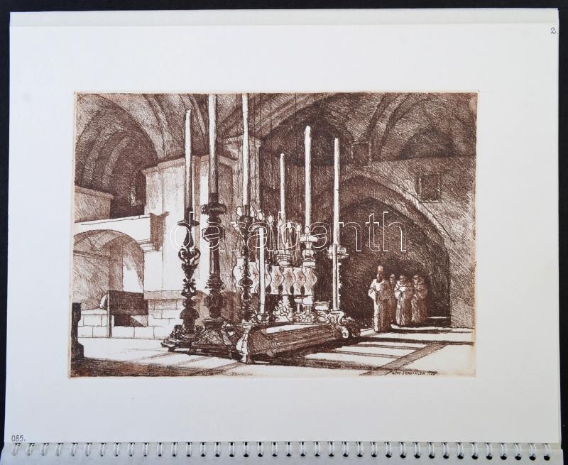 Description: Zádor István 7 darab eredeti rézkarca Jeruzsálemről. Számozott album. Szolnok, 1995. Viktoria Kft. 1 lev. 7 t. (rézkarcok). 14 hártyapapír előzékkel. A rézkarcokat sokszorosította Pataky Béla grafikusművész, az albumokat készítette Tarapcsik Sándor könyvkötészete, Kecskemét. Aranyozott, díszes egésvászon mappában. Számozott példány (85 sz.)
