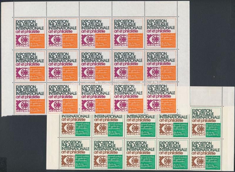1975 Arphila bélyegkiállítás Párizs 2 féle levélzáró 15-ös és 20-as ív...