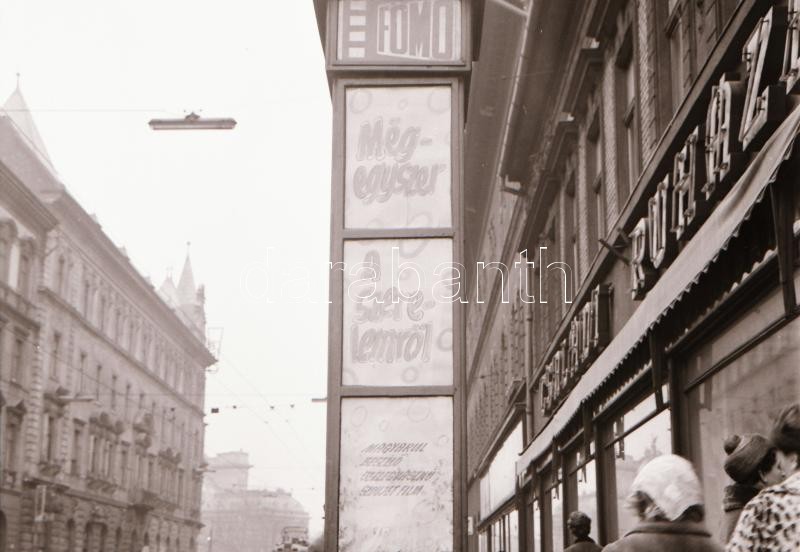 Description: 1969 Budapest, a Fővárosi Moziüzemi Vállalat hirdető oszlopai, plakáthelyei, kirakatai, ahol az új filmeket hirdették, 13 db szabadon felhasználható, vintage negatív, 6x6 cm