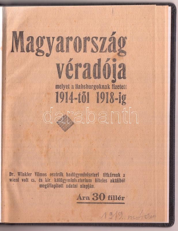 1919 Magyarország véradója melyet a Habsburgoknak fizetett 1914-től 19... https://www.darabanth.com/en/285-Online-auction/285.0/Other-collectibles/Printed-Materials~100027/1919-Magyarorszag-veradoja-melyet-a-Habsburgoknak-fizetett-1914-tol-1918-ig-Dr-Winkler-osztra~II1490783
