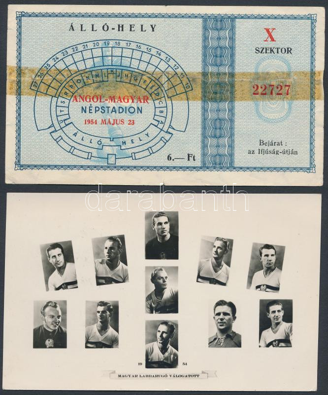 Description: 1954 május 23. Angol-magyar labdarúgó mérkőzés belépőjegye a Népstadionba (a legendás 6:3-as meccs visszavágója) + az Aranycsapat korabeli tabló képeslapon