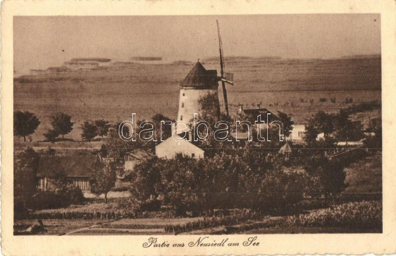 Nezsider, Neusiedl am See; látkép, malom, Heinrich Amon kiadása / gene...
