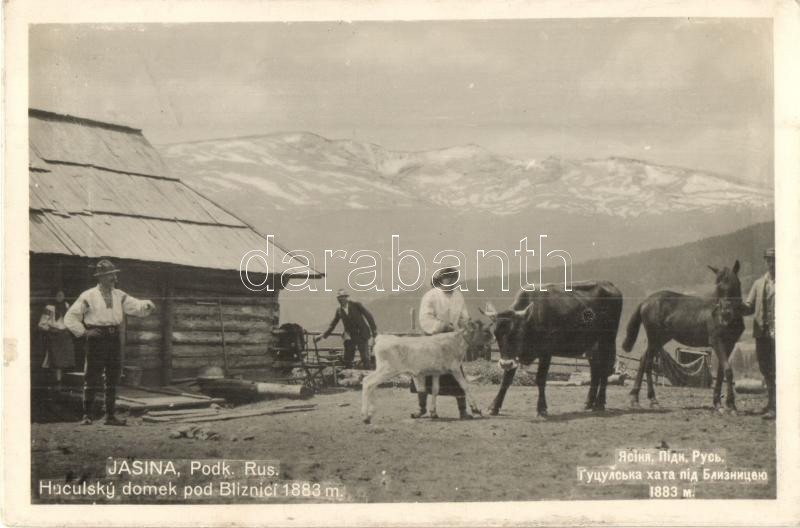 Description: Kőrösmező, Jasina; Huculsky domek pod Bliznici / Hucul ház a hegyen, népviselet, Margit Rosenthal kiadása / Hutsul house on the mountain, folklore (ragasztónyom / glue mark)