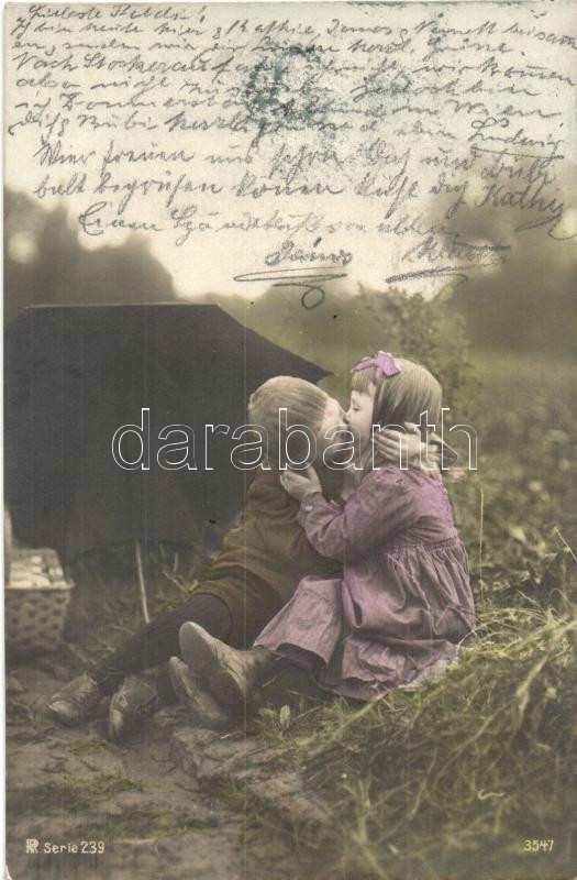 Young couple, kissing children, picnic, Serie 239. No. 3547. (vágott /...