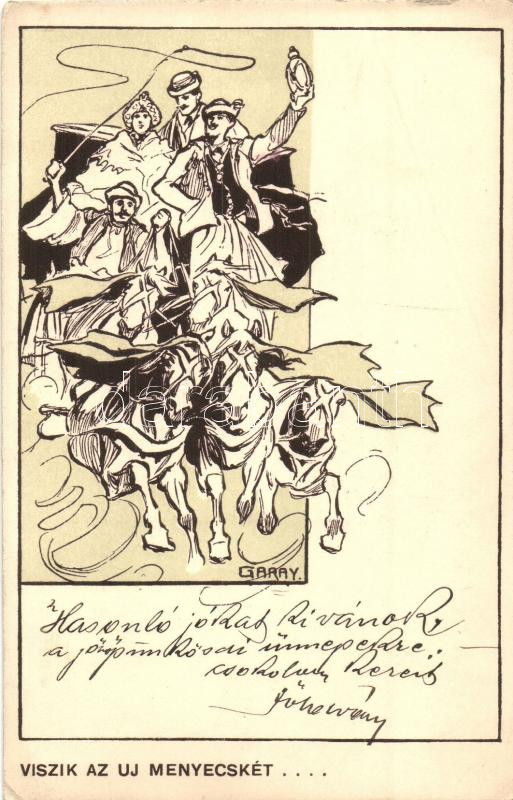 'Viszik az új menyecskét' Kner Izidor kiadása / Hungarian folklore art postcard s: Garay (EK)
