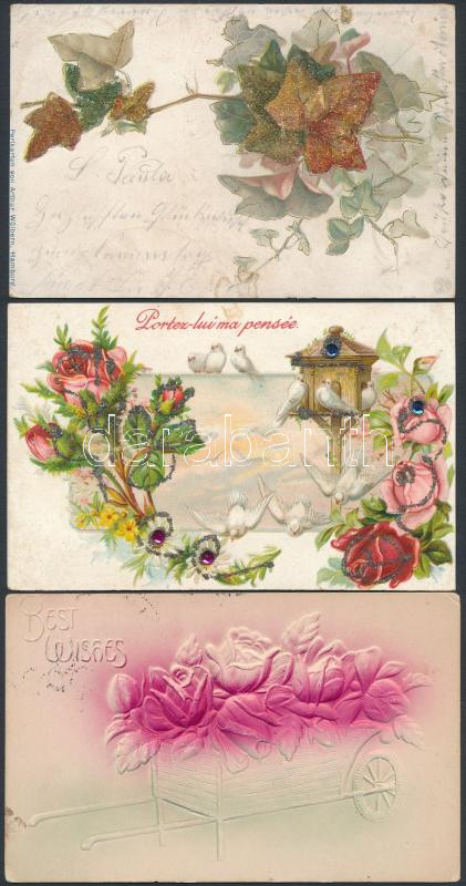 3 db RÉGI virágos üdvözlőlap, dombornyomott és litho darabok / 3 pre-1...