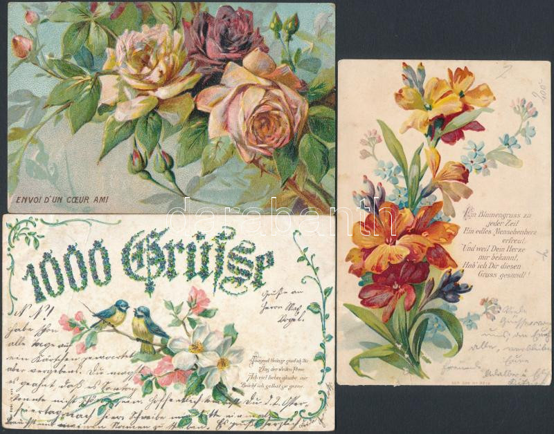 3 db RÉGI virágos üdvözlőlap, dombornyomott és litho darabok / 3 pre-1...