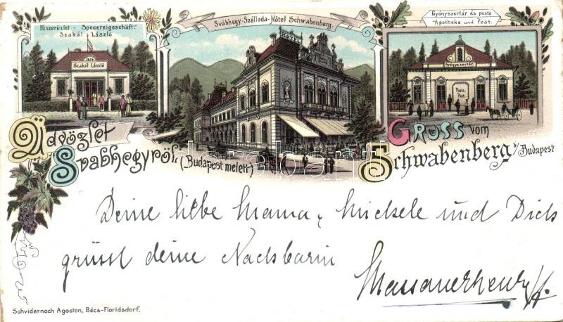 Description: 1898 Budapest XII. Svábhegy, Schwabenberg; Szakál László fűszerüzlete, Szálloda, Gyógyszertár és posta; Schwidernoch Ágoston floral litho (vágott / cut)
