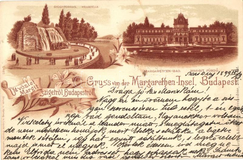 1899 Budapest XIII. Margitsziget, gyógyforrás, Margit fürdő, hátoldalon Rettegi Unghváry család pecsétje. litho