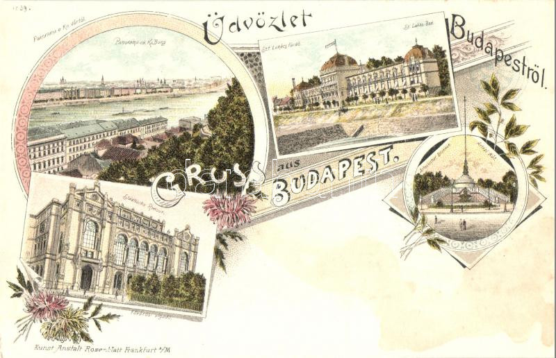 Budapest, Fővárosi vigadó, Artézi kút, Szent Lukács fürdő, Kir. vár, floral Art Nouveau Rosenblatt litho (fl)