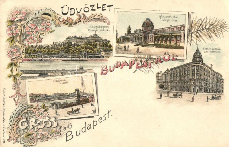 Budapest, Királyi vár és várbazár, Margit fürdő, Nemzeti Színház, Lánchíd, Kunstanstalt Rosenblatt floral Art Nouveau litho (EK)